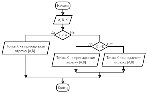 составьте блок схему алгоритма определения принадлежности точки Х отрезку(А,В) с использованием комбинации из2 ветвлений