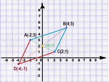 Эти координаты входят в формулы для определения середины диагонали ВD, включающие координаты точки D. И их легко найти, так как координаты точки В известны (4,5), а точки К уже вычислены:
