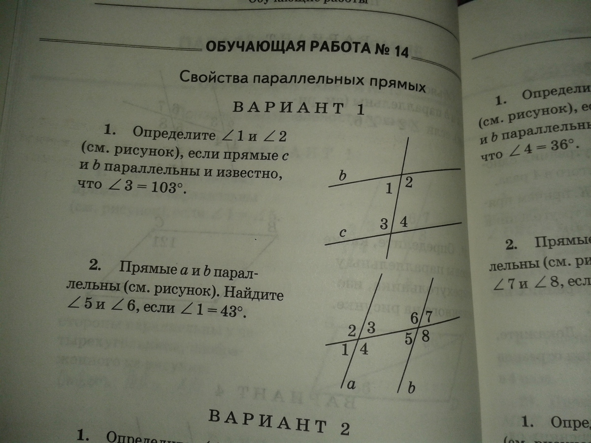 определите угол 1 и угол 2 если прямые с и б параллельны и известно,что угол 3 равен 103 градусам