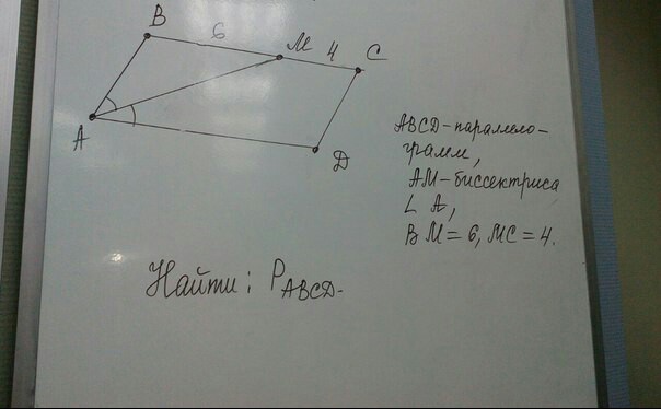 угол МАD=углу BAM=углу BMA(как накрест лежащие)Значит, треугольник ABМ-равнобедренный и ВМ = АВ=6 см. BC+ CD+ AD+АВ=6+6+4+6+6+4=32 см-периметр