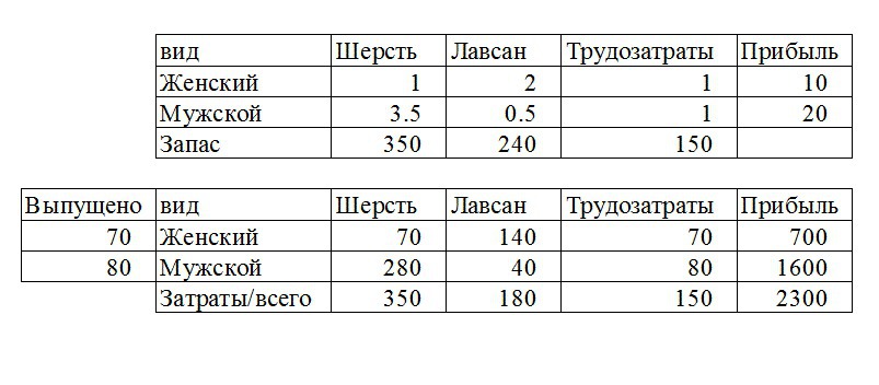 На женский костюм требуется 1 м шерсти, 2м лавсана и 1чел/день трудозатрат. На мужской костюм требуется 3,5 м шерсти, 0,5 м лавсана и 1чел/день трудозатрат. Всего имеется 350 м шерсти, 240 м лавсана и 150 чел/день трудозатрат. Определить сколько костюмов каждого вида необходимо сшить, чтобы обеспечить максимальную прибыль, если прибыль от реализации женского костюма составляет 10 денежных единиц, от мужского – 20 денежных единиц. При этом следует иметь в виду, что необходимо сшить не менее 60 мужских костюмов. Помогите решить в экселе