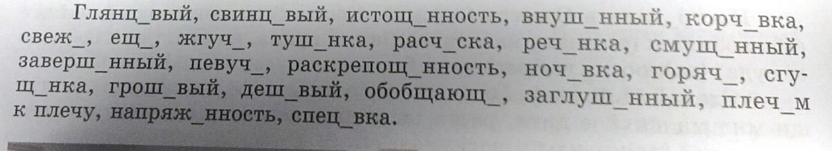 Глянцевый, свинцовый, истощенность, внушенный, корчевка, свежо, ещё, жгуче, тушёнка, расчёска, речонка, смущенный, завершённый, певуче, раскрепощенность, ночевка, горячо, сгущёнка, грошовый, дешёвый, обобщающе, заглушенный, плечом к плечу, напряженность, спецовка.