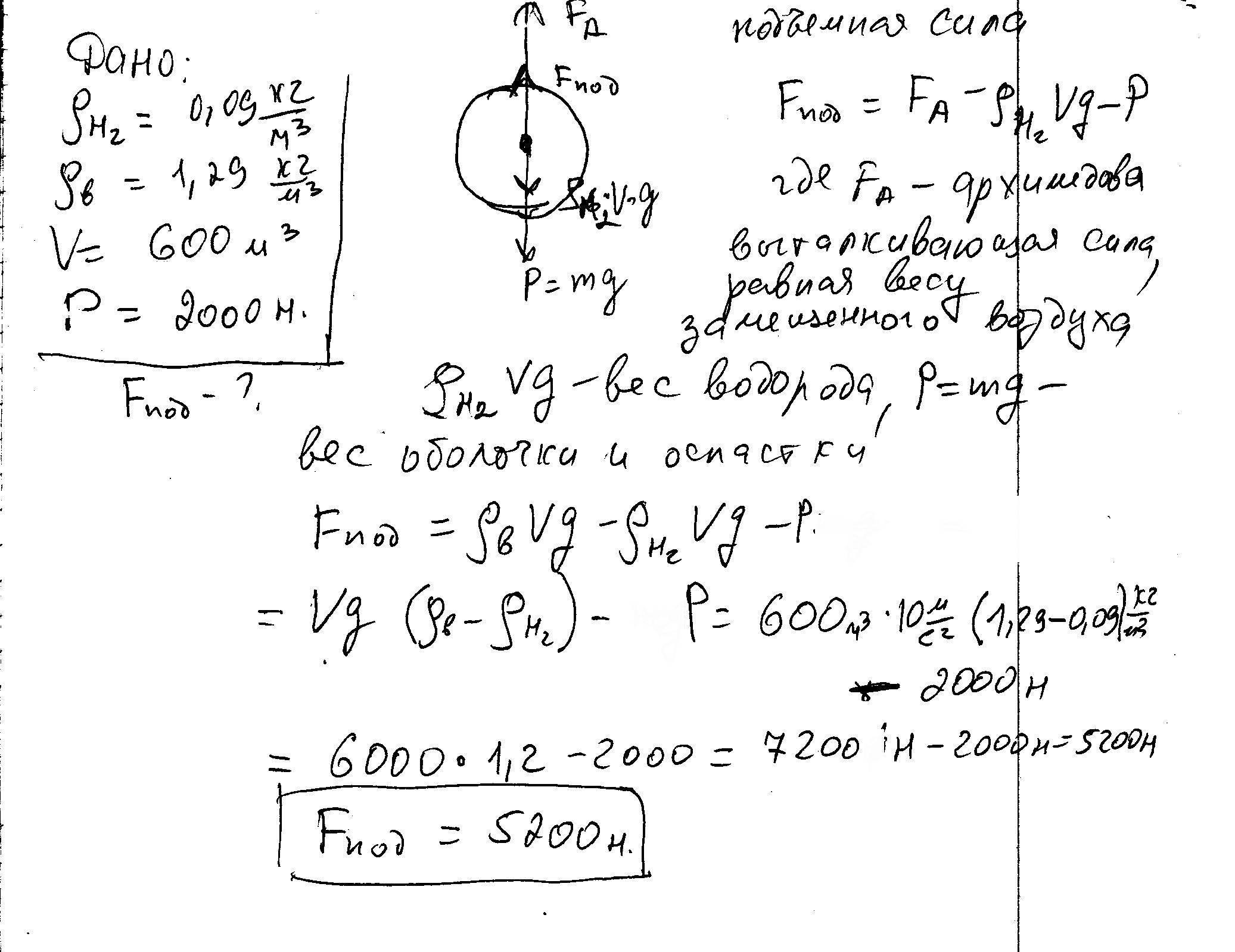 Какова подъемная сила аэростата, вмещающего 600 м3 водорода, если оболочка с корзиной весят 2000 Н?