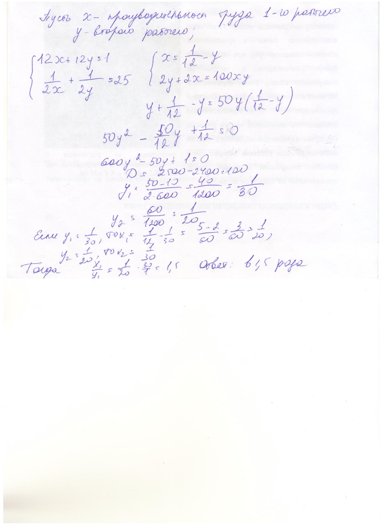 Два рабочих совместно могут выполнить заданную работу за 12 дней. если первый рабочий сделает половину работы, а затем второй другую половину, то вся работа будет законченна за 25 дней. во сколько раз один из рабочих работает быстрее другого?