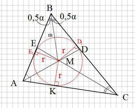 В треугольнике АВС биссектрисы АД и СЕ пересекаются в точке М , ВМ=m уголАВС=альфа, найдите расстояние от точки М до стороны АС.