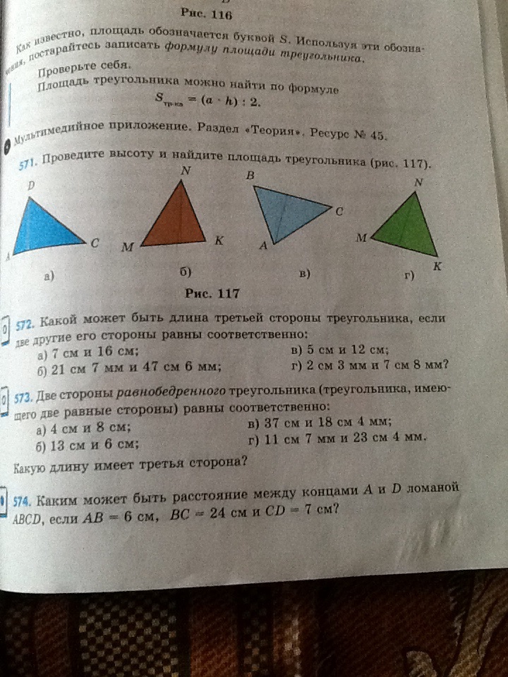 Проведите высоту и найдите площадь треугольника (рис.117).