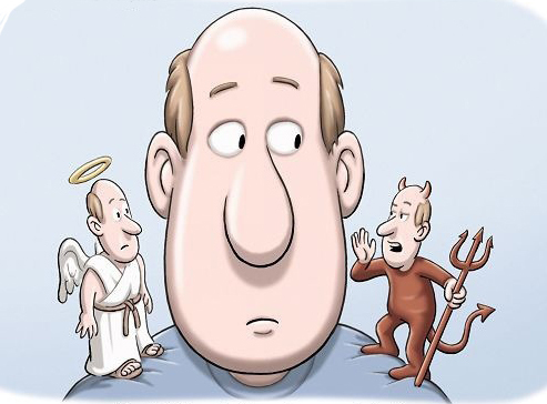 Нашла такую картинку. Может. что-то похожее на это нарисовать, с одной стороны - добро, с другой - зло. Трудное у вас задание)