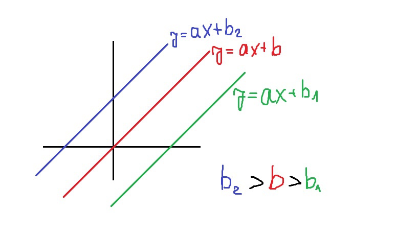 Уравнение прямой: y = ax + b. Коэффициент a отвечает за угол наклона прямой к положительной оси ОХ: чем больше коэффициент а, тем больший угол будет образован, следовательно, чем меньше а, тем меньше угол будет образован. Коэффициент b отвечает за смещение прямой по оси OX: чем больше коэффициент b, тем больше прямая смещена влево, следовательно, чем меньше коэффициент b, тем больше прямая смещена вправо.