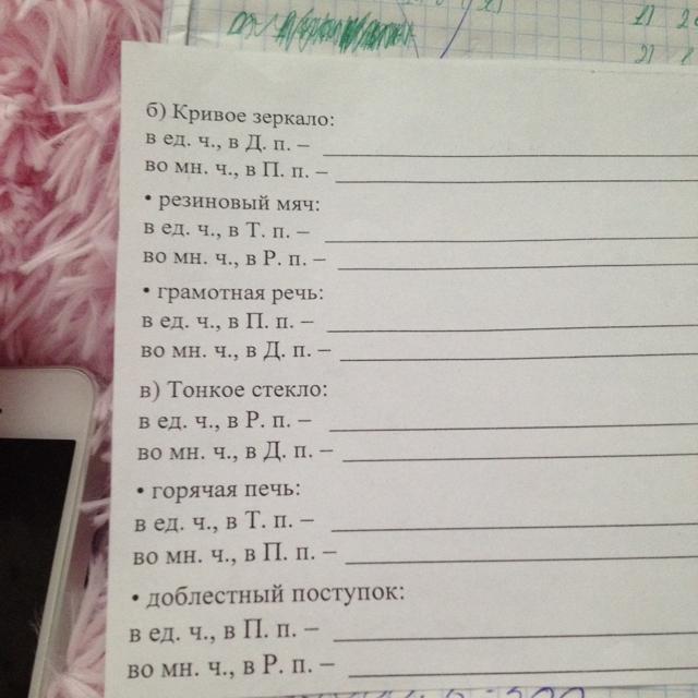 кривому зеркалу, о кривых зеркалах; резиновым мячом, резиновых мячей; о грамотной речи, грамотным речам; тонкого стекла, тонким стеклам; горячей печью, о горячих печах; о доблестном поступке, доблестных поступков