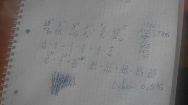 1)69/70:7/23=3/10 2)4/25:4/5=1/5 3)3/5*25/36=5/12 4)3/10-1/5=1/10 5)1/10+5/12=31/60