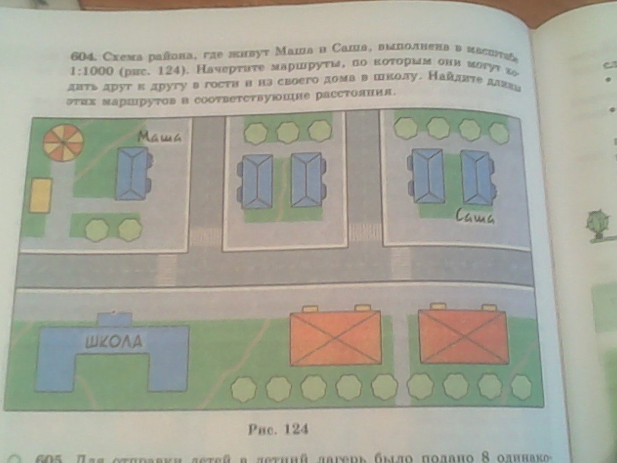 Даю много баллов !!! Схема района,где живут Маша и Саша,выполнена в масштабе 1:1000(рис124) начертите маршруты ,по которым они могут ходить к друг другу в гости и из своего дома в школу