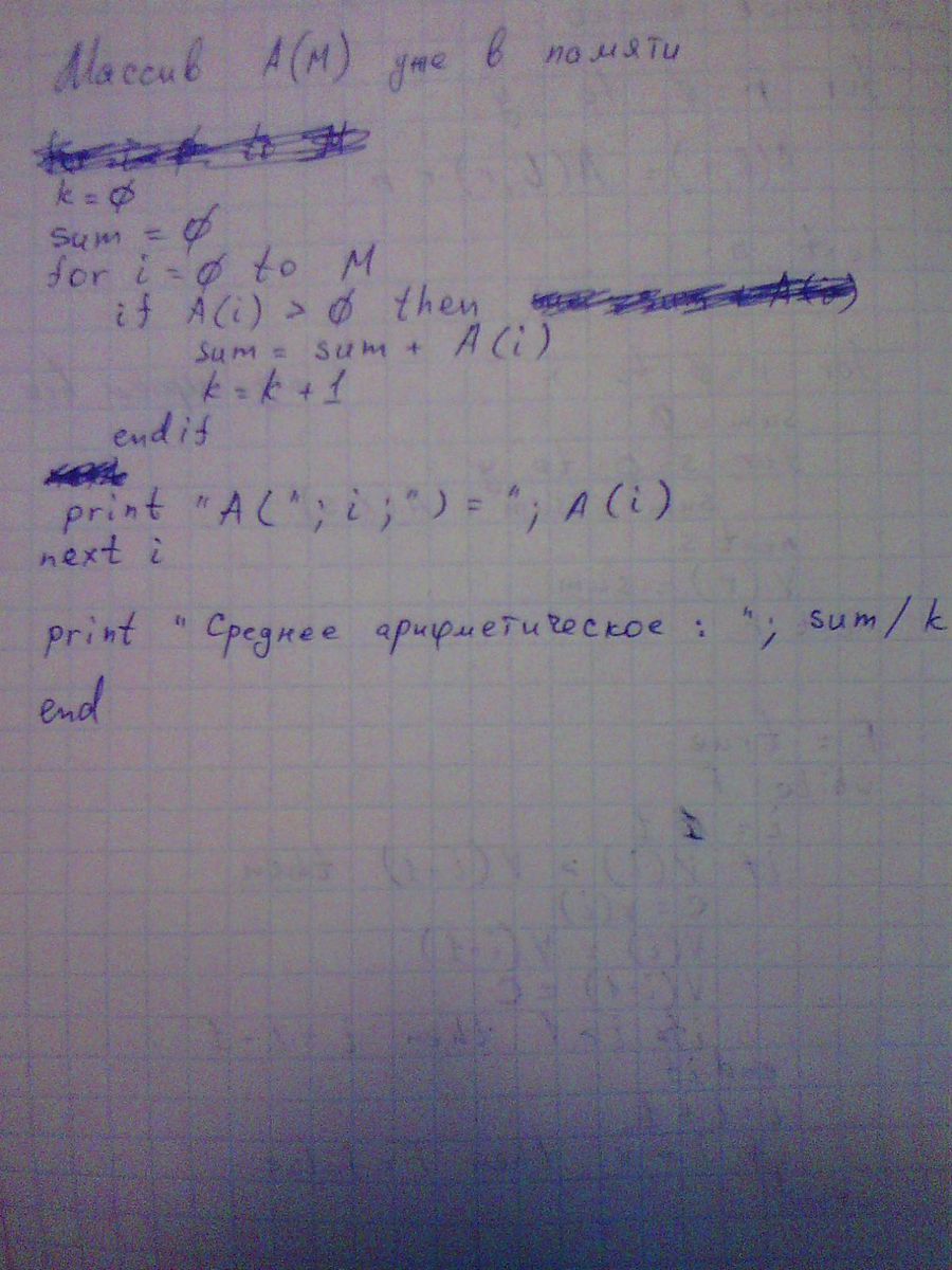 . Дан одномерный массив А(М). Вывести массив на экран. Найти среднее арифметическое положительных элементов. Вывести результат на экран.