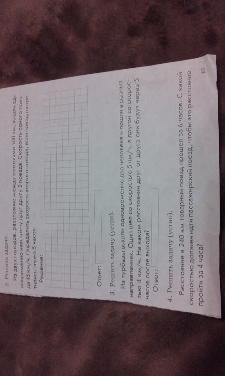 1)500:5=100(км/ч)-общая скорость обеих поездов 2)100-45=55(км/ч)- скорость второго поезда Ответ:55 км/ч Задача номер 3 1)5+4=9(км/ч)-скорость удаления 2) 9*5=45(км/ч) расстояние между туристами через 5 ч Ответ:45 км/ч