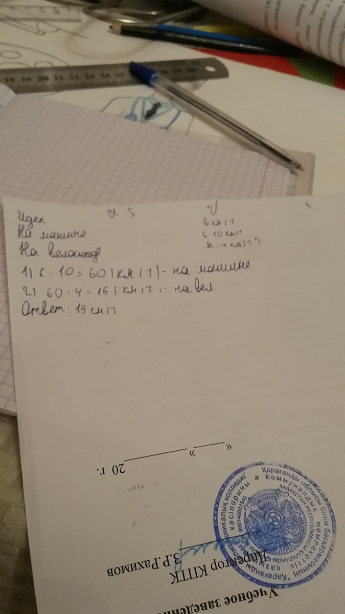 Папа сказал, что он идёт со скоростью 6 км/ч, на машине едет в 10 раз быстрее, а на велосипеде - в 4 раза медленнее, чем на машине. С какой скоростью папа едет на велосипеде?