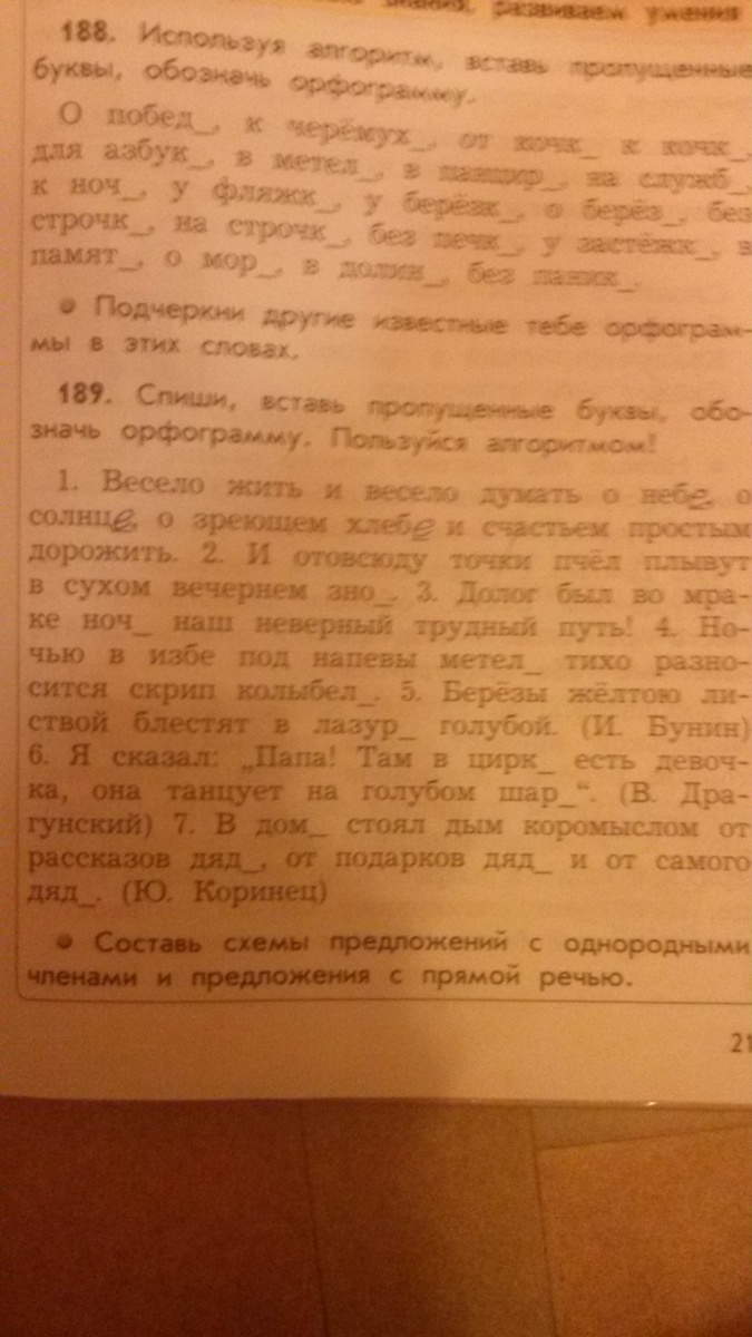 Спиши,вставь пропущенные буквы,обозначь орфограмму. Пользуясь алгоритмом!Состав схемы предложений с однородными членами и предложения с прямой речью.1.Весело жить и весело думать о неб...,о солнц...,о зреющем хлеб... и счастьем простым дорожить.2.И отовсюду точки пчёл плывут в сухом вечернем зно...3. Долог был во мраке ноч... наш неверный трудный путь!