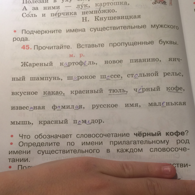 новое пианино(ср.р), яичный шампунь(м.р.), широкое шоссе(ср.р.), стАльной рельс(м.р.), вкусное какао(ср.р.), красивый тюль(м.р.), чёрный кофе(м.р.), известная фамилия(ж.р.), русское имя(ср.р.), маленькая мышь(ж.р.), красный помидор(м.р.).