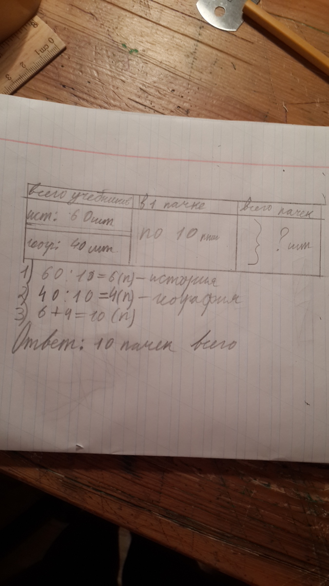 Как составить таблицу к задаче: В школьную библиотеку привезли 60 учебников по истории и 40 учебников по географии в пачках по 10 книг в каждой. Сколько всего пачек учебников привезли в библиотеку?