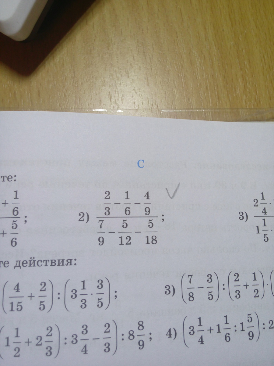 Получается: (2/3-1/6-4/9):(7/9-5/12-5/18)=