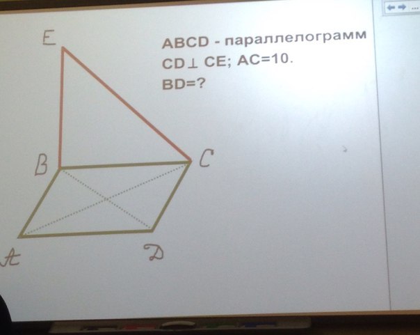 BD= 10. Так как АВСD параллелограмм, то в нём параллельные стороны и углы равны(по теореме)
