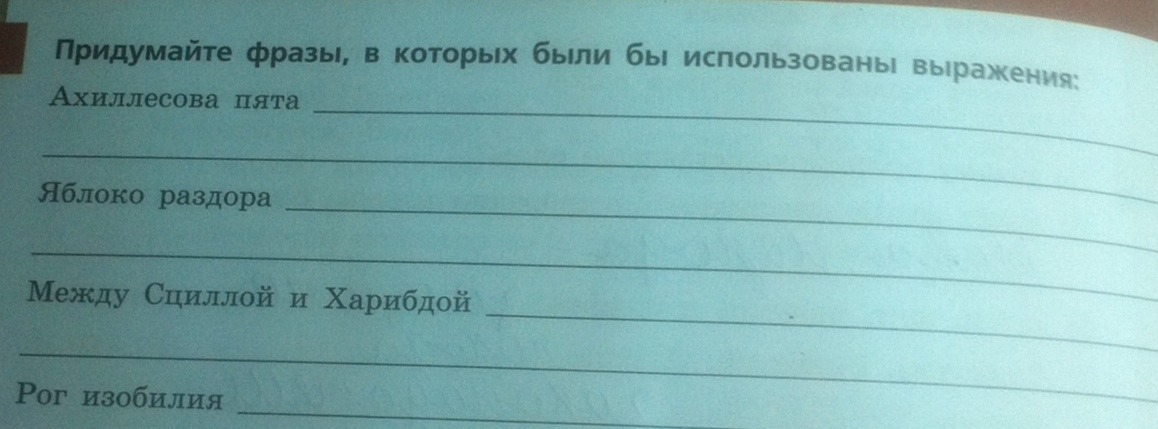 1 Мама это же моя Ахиллесова пята !!! 2 девочки да это же какое то яблоко раздора! 3 Галина Сергеевна да я же стою между Между Сциллой и Харибдой 4 ухты бабушка ты мне подарила прямо рог изобилия