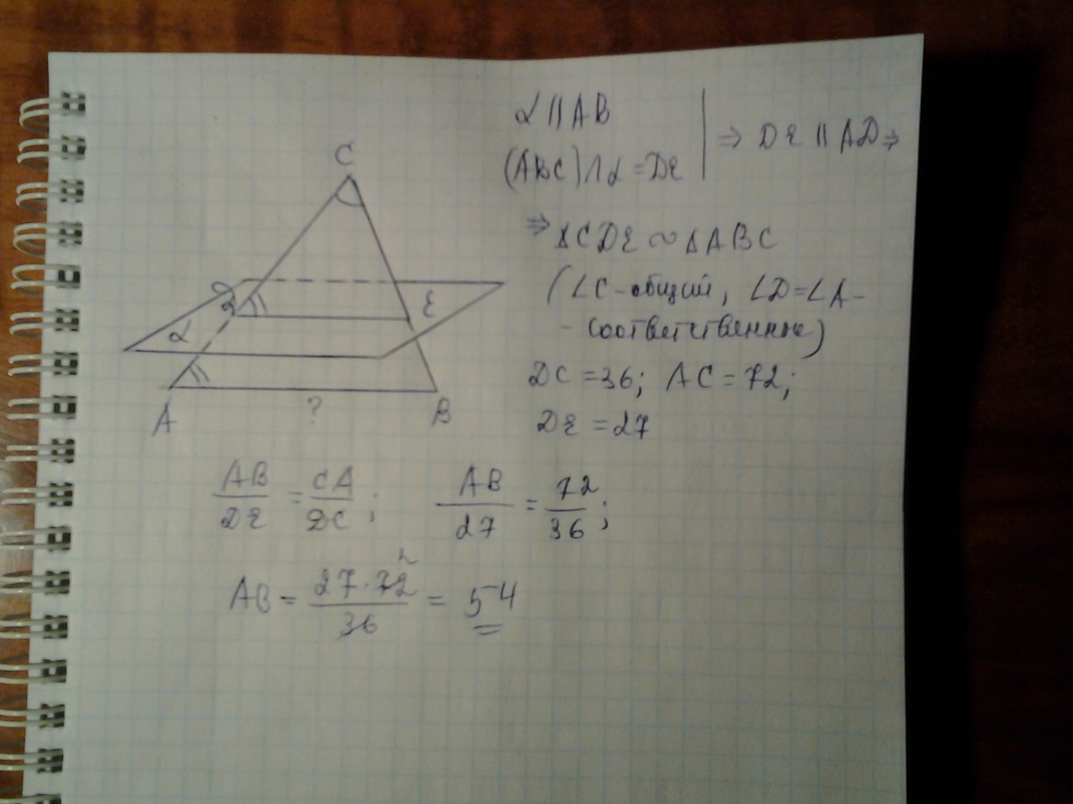 дан треугольник абс.плоскость параллельная прямой аб ,пересекает ас в точке д,а сторону бс в точке е.найдите длину отрезка аб,если дс-36 см,ас-72см,де-27см.