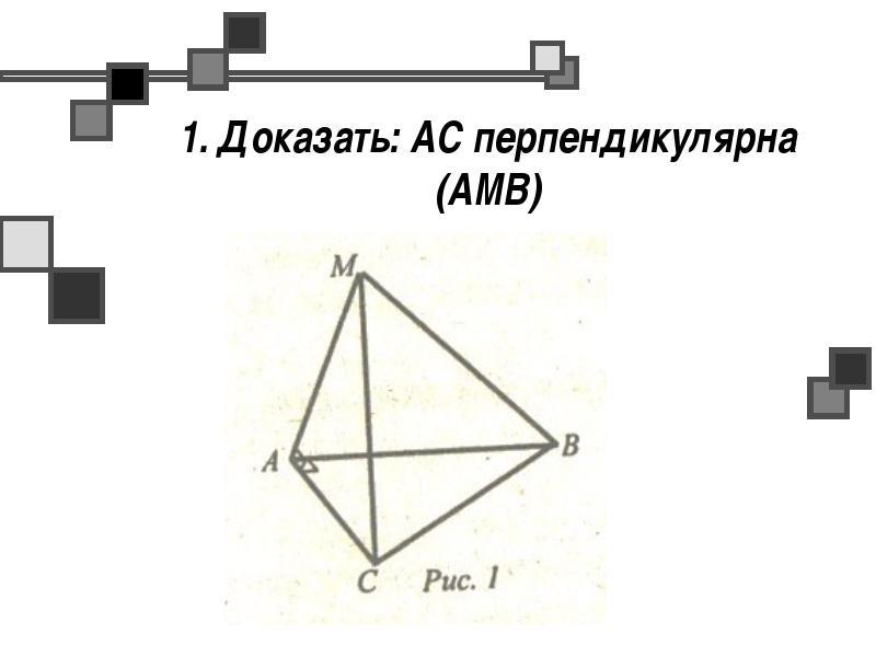По рисунку очевидно, что АС ⊥ АМ и АС⊥АВ. Но АМ и АВ - пересекающиеся прямые, принадлежащие плоскости АМВ, значит по признаку перпендикулярности прямой и плоскости ("если прямая перпендикулярна к двум пересекающимся прямым, лежащим в плоскости, то она перпендикулярна к этой плоскости") имеем что АС⊥(АМВ).