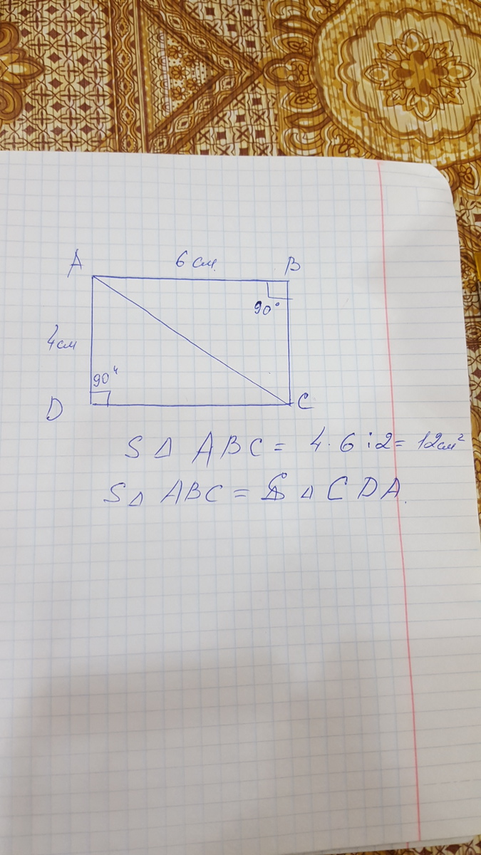 прямоугольник со сторонами 6 сантиметров и 4 сантиметра разделили на два равных прямоугольных треугольников Начерти такой прямоугольный треугольник найти его площадь