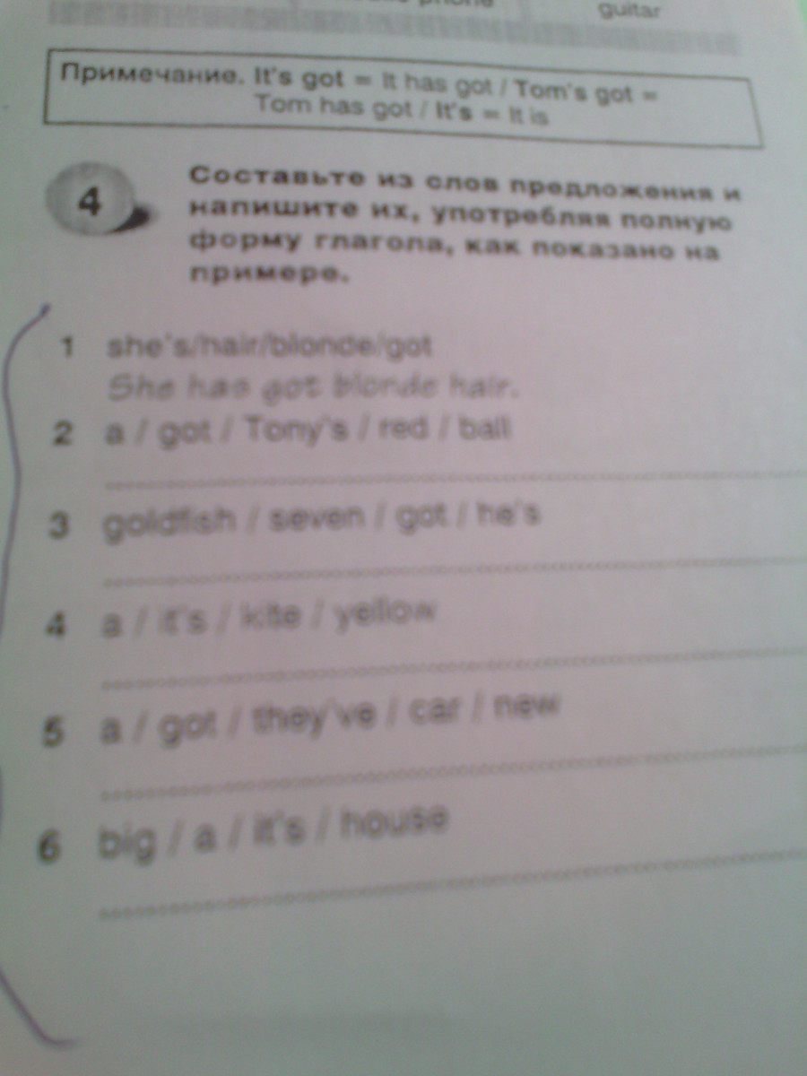 1.Tony has got a red ball 2. He has got seven... 3. Its a yellow kite 4.They have got a new cat 5. Its a big house