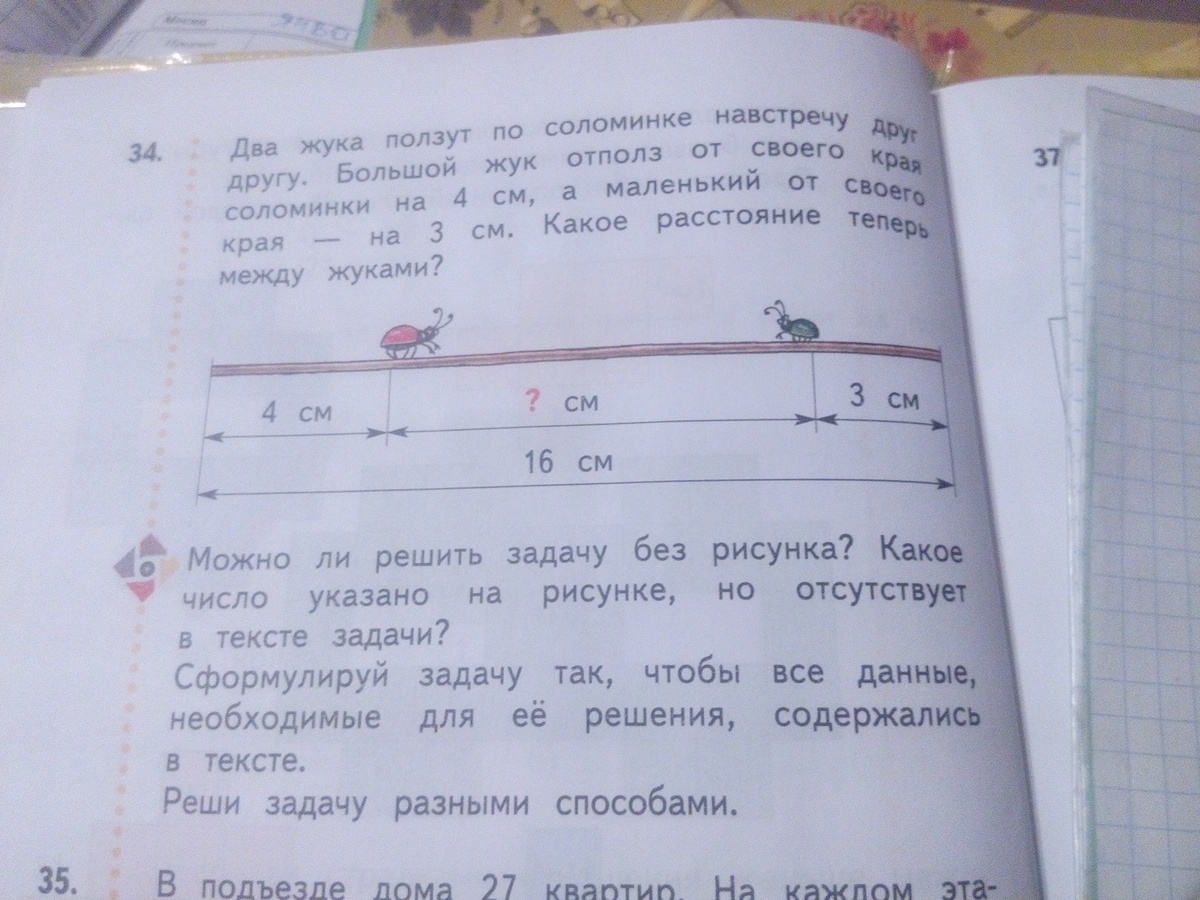 Два жука ползут по соломинке навстречу друг другу. Большой жук отполз от своего края соломинки на 4см,а маленький от своего края на 3 см. Какое расстояние теперь между жуками?
