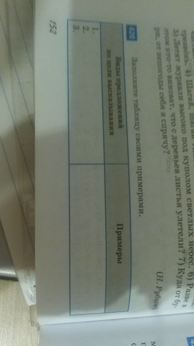 повествовательные(Вчера я ходил в школу.), вопросительные(Он идёт в школу?), побудительные(Возвращайся поскорее.)