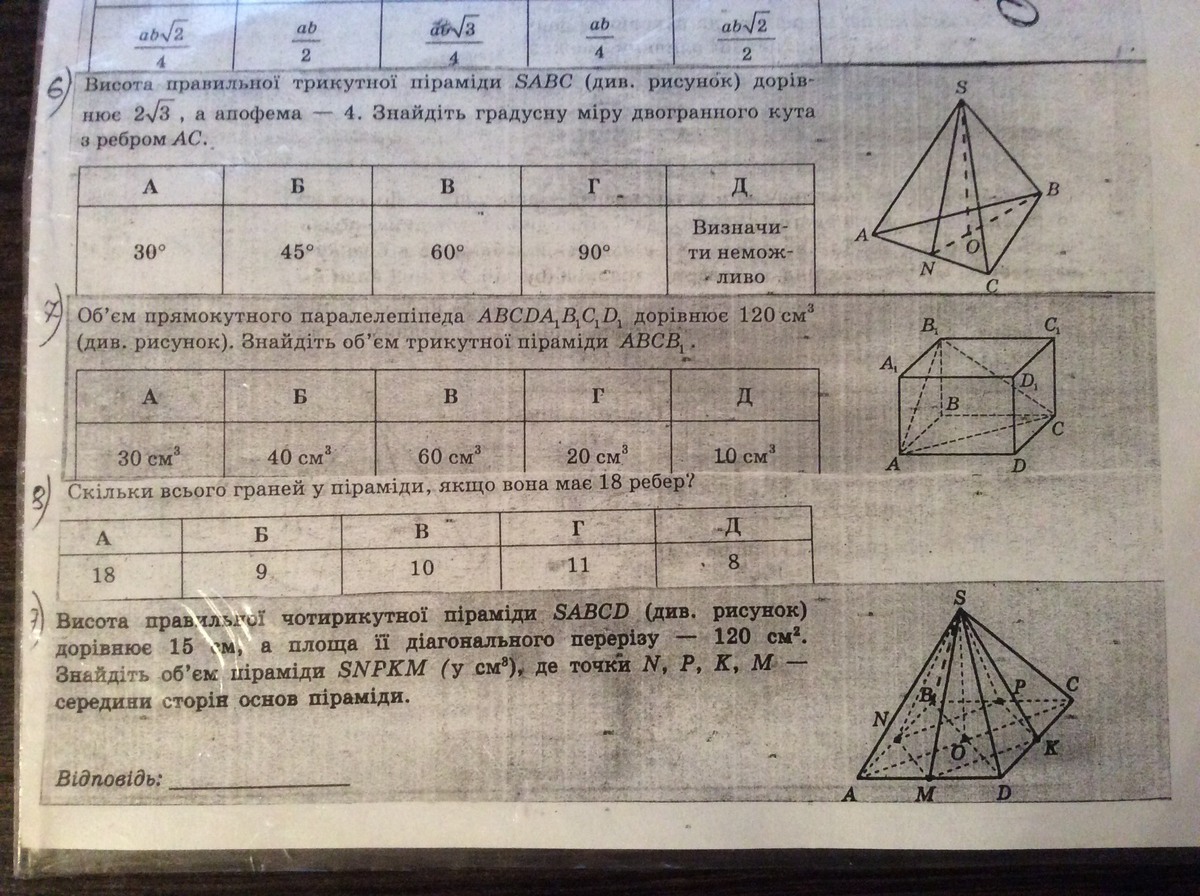 V₁ =(1/3)S₁*H =(1/3)(a*b/2)*H =(1/6)ab*H =(1/6)V = (1/6)*120 см³ =20 см³.