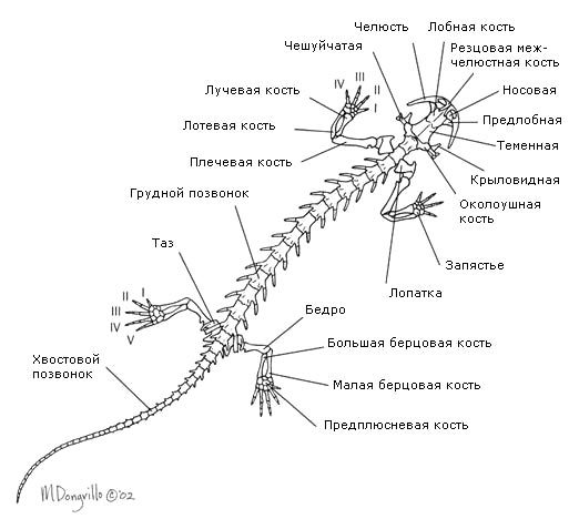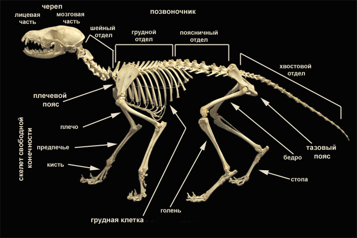 Скелет разделен на отделы: осевой скелет(позвоночник), скелет головы(череп),скелет парных конечностей.