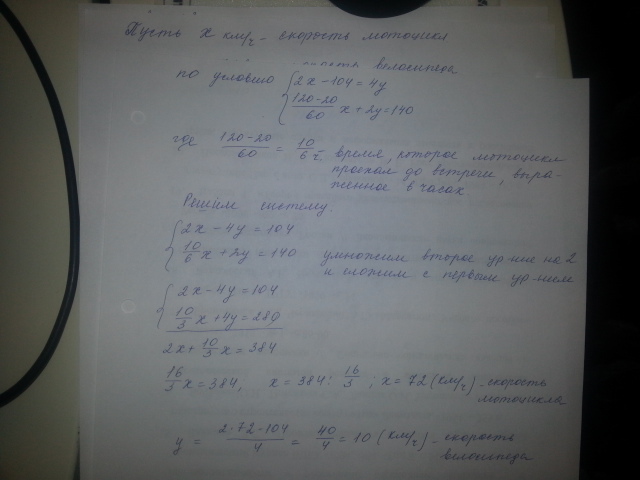 СРОЧНО!!!СРОЧНО!!СРОЧНО!!СРОЧНО!!СРОЧНО!!СРОЧНО!!СРОЧНО!!СРОЧНО!!СРОЧНО!!СРОЧНО!!СРОЧНО!!СРОЧНО!!СРОЧНО!!СРОЧНО!!СРОЧНО!!СРОЧНО!!СРОЧНО!!СРОЧНО!!СРОЧНО!!СРОЧНО!!СРОЧНО!!СРОЧНО!!СРОЧНО!!Из села А в село В расстояние между которыми равно 140 км, выехал мотоциклист . за 20 минут до этого на встречу ему из В в А выехал велосипедист, который встретился с мотоциклистом через 2 часа после своего выезда. Найдите скорость каждого из них, если мотоциклист за 2 часа проезжает на 104 км больше, чем велосипедист за 4 часа.