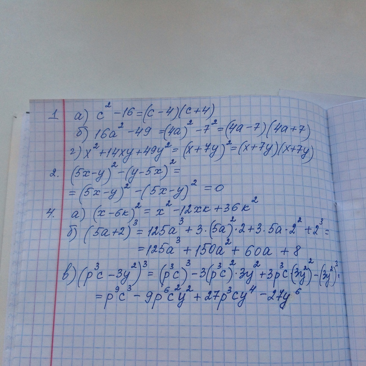 х2+14ху+49у2. 2. Представьте в виде многочлена стандартного вида: (5х-у)2-(у-5х)2. 3. Вычислите с помощью формул сокращенного умножения: а)6,82; б) 312. 4. Преобразуйте в многочлен: а)(х-6к)2; б)(5а+2)3; в) (р3с-3у2)3.