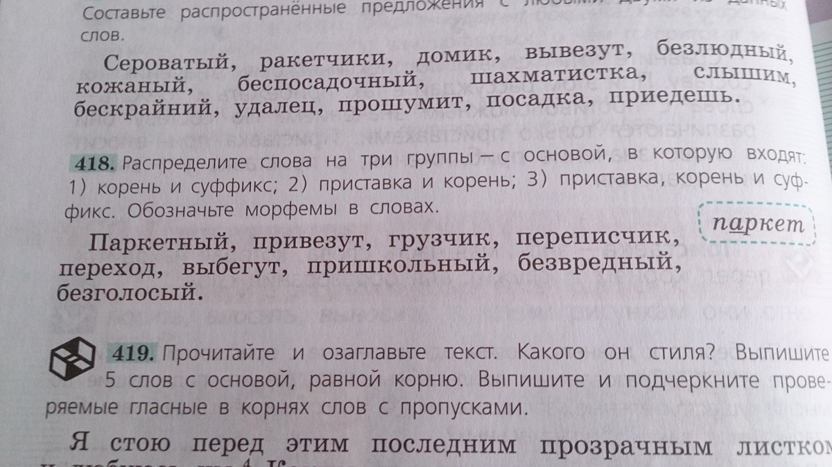 1. Паркетный,грузчик 2. Привезут, переход, выбегут, безголосый 3. Переписчик, пришкольный, безвредный