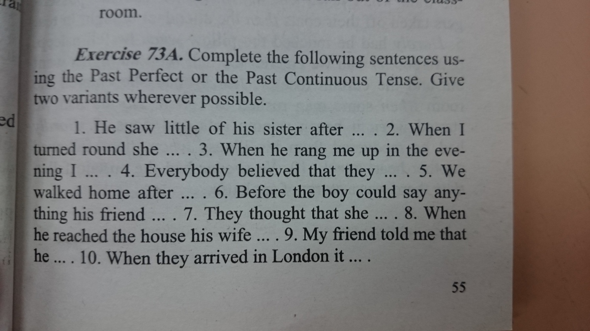 1 after he had left for college. 2 was dancing with her friends. 3 was doing my homework. 4 had done everything right. 5 the classes had been over.. 6 was already packing his things ready to go home. 7 had been a famous actress. 8 was cooking dinner. 9 had been abroad. 10 it was darkening.