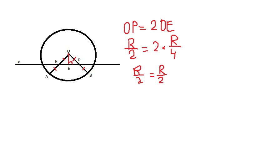 У колі з радіусами АО і ОВ пряма а проходить через середини радіусів так, що ОЕ = ОА/4. Оскільки відстань - це перпендикуляр, маємо прямокутний трикутник КОЕ та РОЕ. З прямокутного трикутника КОЕ: ОК = ОА/2, ОЕ = ОА/4. Тобто, катет ОЕ у два рази менший за гіпотенузу ОК. Катет, що дорівнює половині гіпотенузи, лежить проти кута 30 градусів. Тобто, кут ОКЕ = 30 градусів. Кут КОЕ = 90 - 30 = 60 градусів. Трикутники КОЕ та РОЕ рівні за прямим кутом та гіпотенузою, тобто кути КОЕ та РОЕ рівні і дорівнюють по 60 градусів. Кут АОВ = <KOE + <POE = 60 + 60 = 120 градусів.