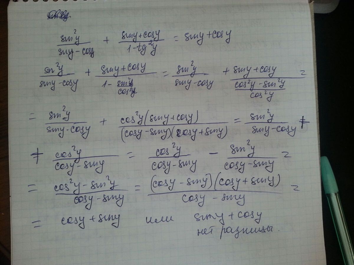 ( sin^2(y) / ( sin(y)-cos(y) ) ) + ( ( sin(y) + cos(y) ) / ( 1 - tg^2(y) ) ) = sin(y) + cos(y);