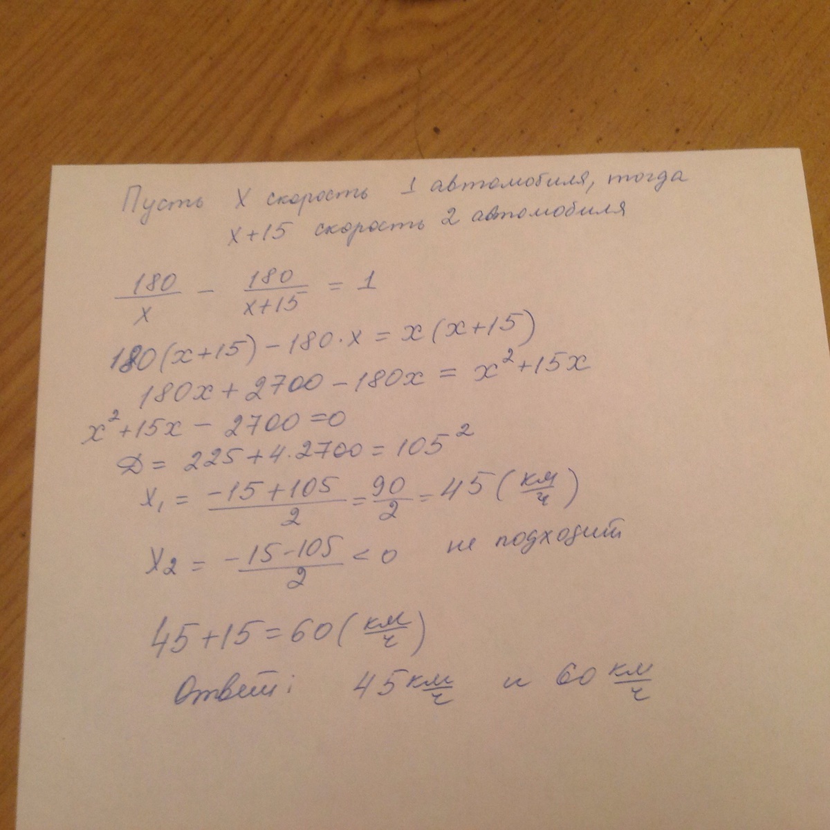из одного города в другой, расстояние между которыми 180 км, выехали одновременно два автомобиля. Так как скорость одного автомобиля на 15 км в час больше