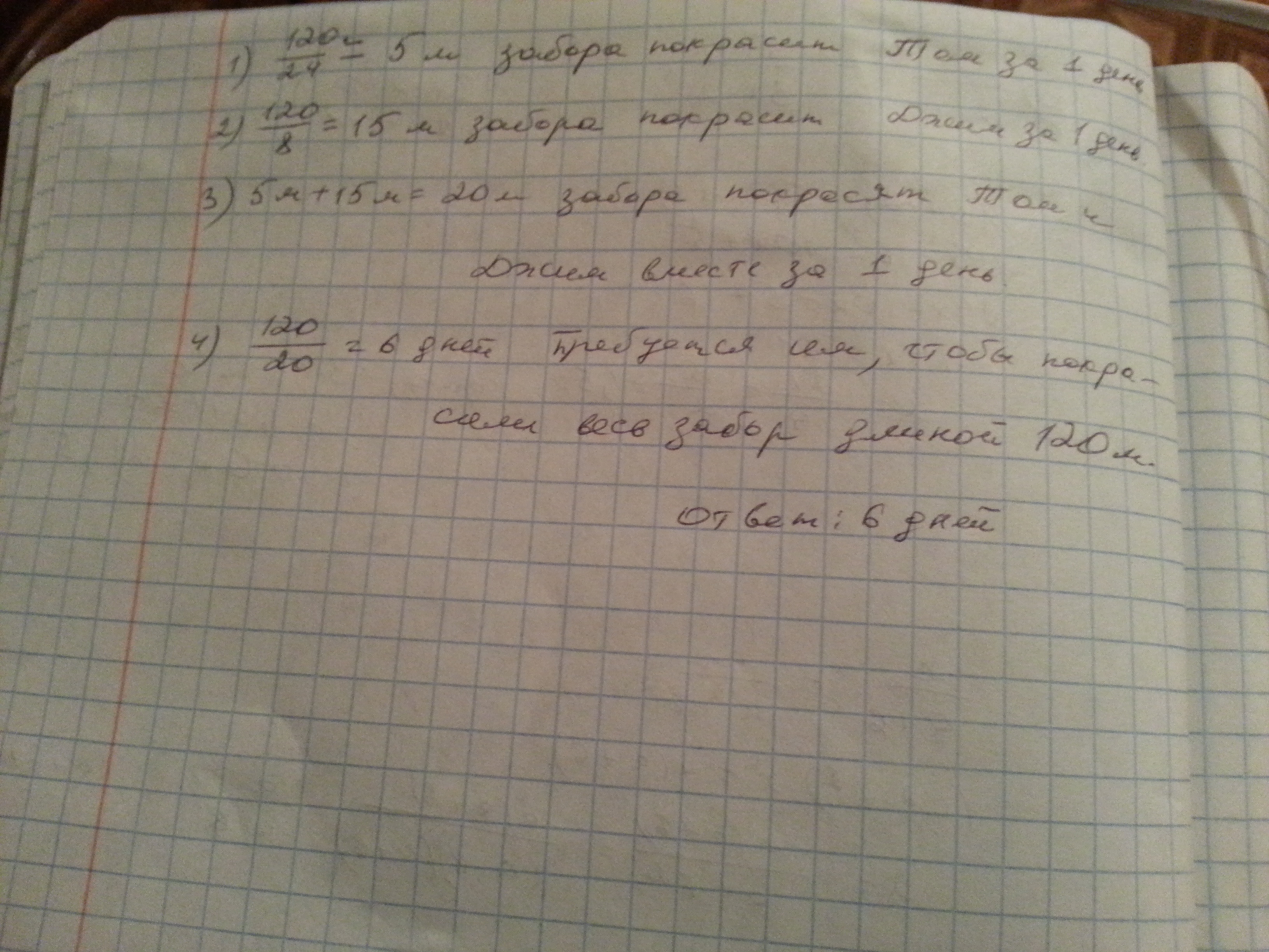 Том Сойер и Джим должны покрасить забор у тети Полли . Длина забора 120 м . Том может покрасить забор за 24 дня , а Джим за 8 дней . За сколько дней покрасят забор Том и Джим вместе?