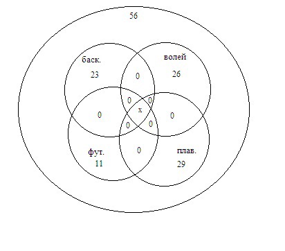 В параллели 10-11-х классов все учащиеся записаны в спортивные секции. Секцию по баскетболу посещают 23 человека, секцию по волейболу посещают 26 человек, секцию по футболу – 11 человек, а секцию по плаванию посещают 29 человек. Сколько учащихся посещает четыре секции, если в 10-11-х классах обучается всего 56 человек, и нет ребят, которые бы посещали две или три спортивные секции.