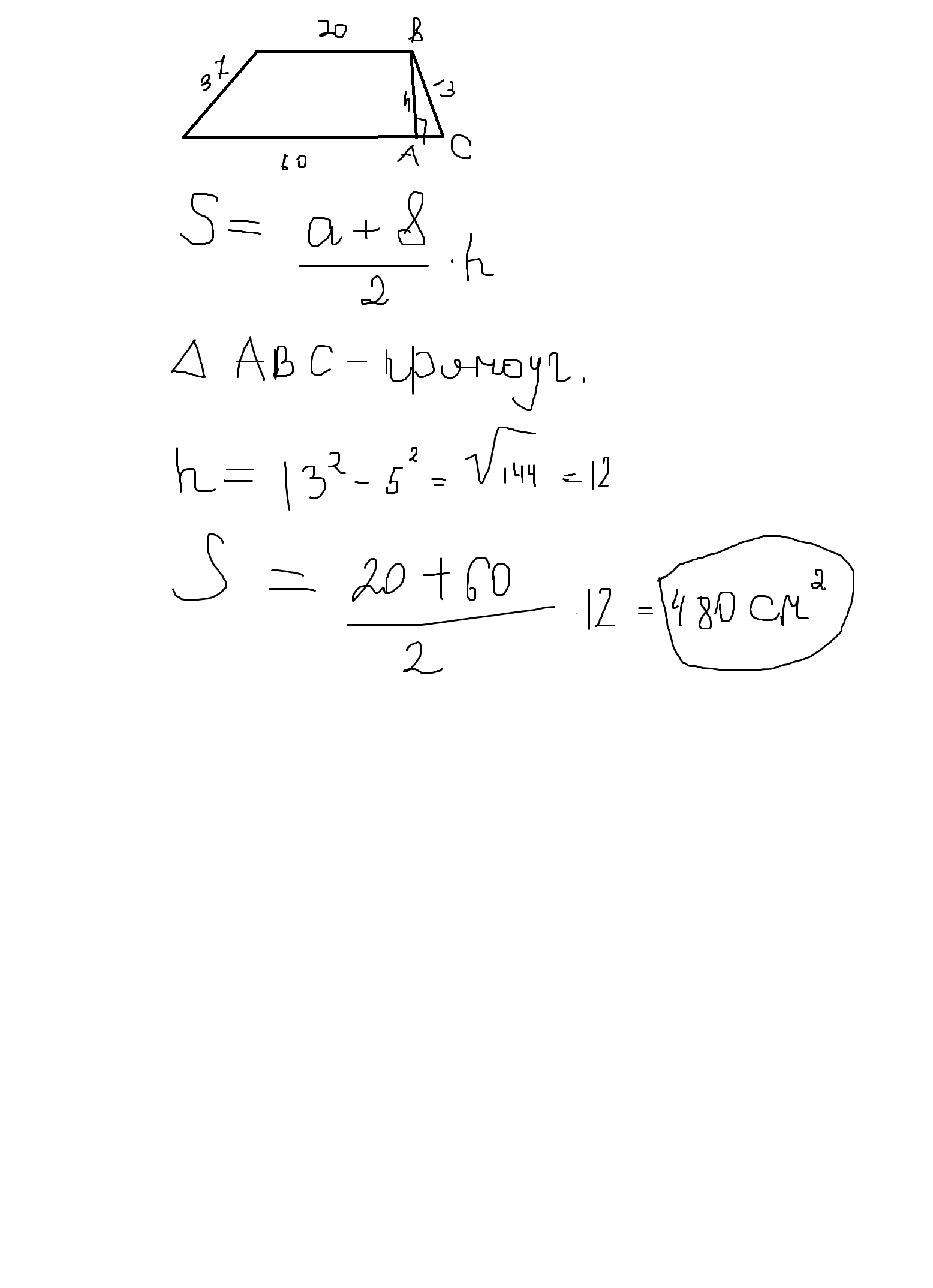 1.Дано: АВСД - трапеция, ВС//АД,ВС=20см, АД=60см, АВ=13см, СД=37см.
