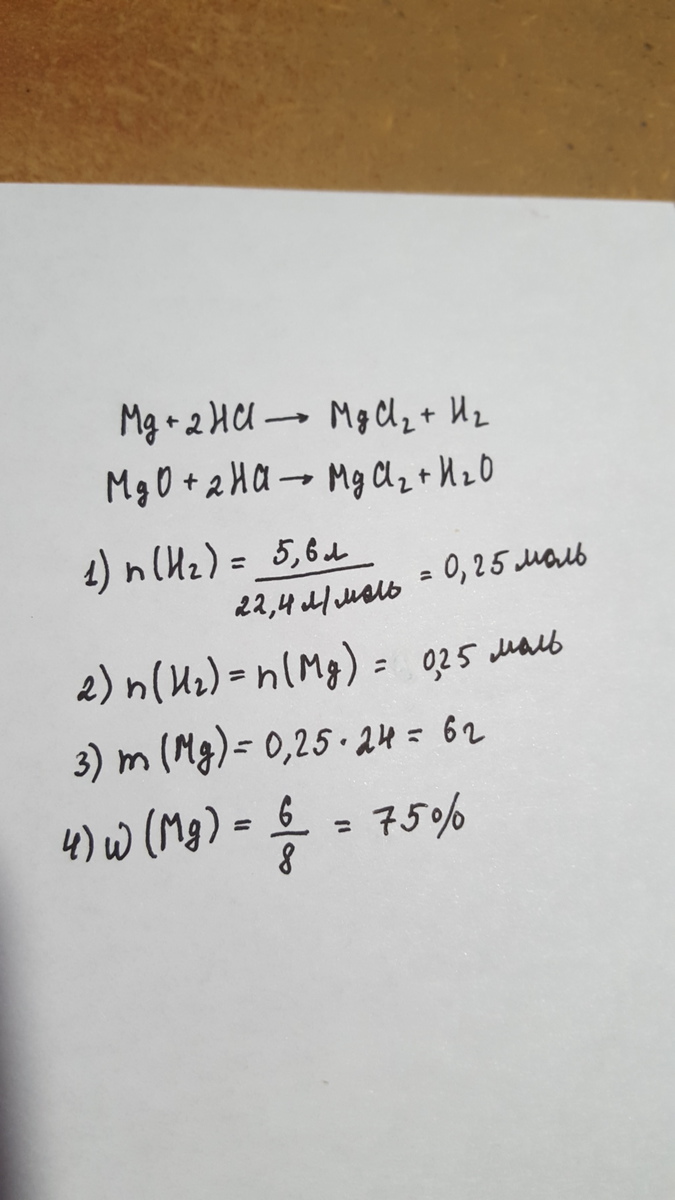 при обработке 8г смеси магния и оксида магния соляной кислотой выделилось 5.6 л водорода (н.у.).