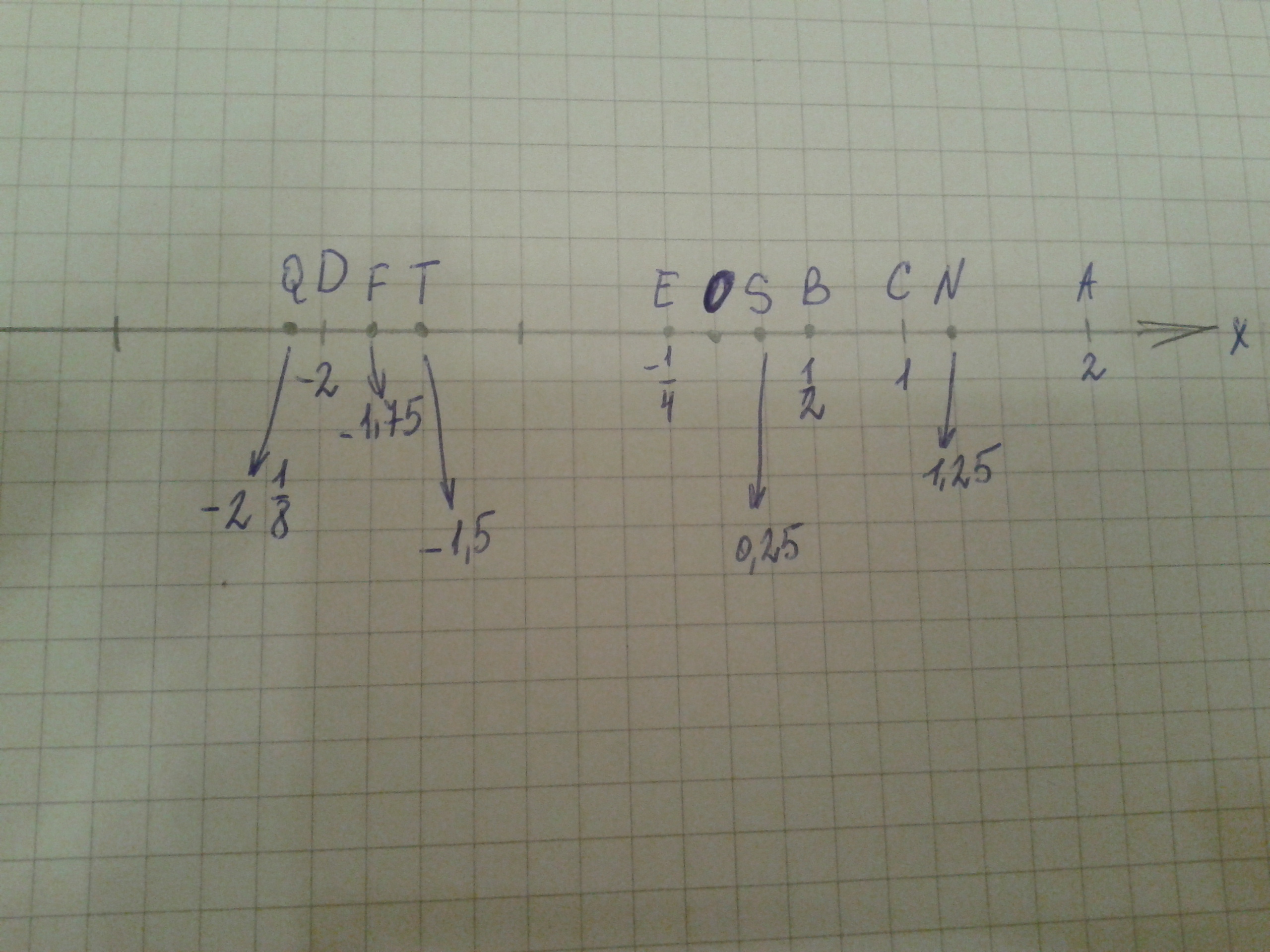1/4), D (-2), E (-1/4), F (-1,75), Q (-2 1/8), S (0,25), T (-1,5), N (1,25). Помогите.