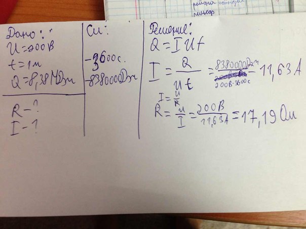 напряжение в сети электрички 200 В. для отопления вагона необходимо в час количество теплоты, равное 8 38 МДж. Какая сила тока необходима для отопления? каково должно быть сопротивление нагревательного прибора?