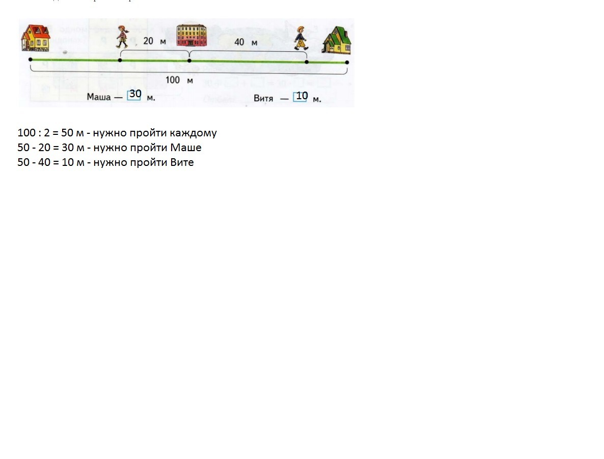 Маша и Витя идут из школы домой в противоположных направлениях по дорожке длинна которой 100м. Маша прошла 20м. а Витя 40м. Сколько метров каждому из них осталось пройти до дома если дома Маши и Вити находятся на одинаковом расстоянии от школы?