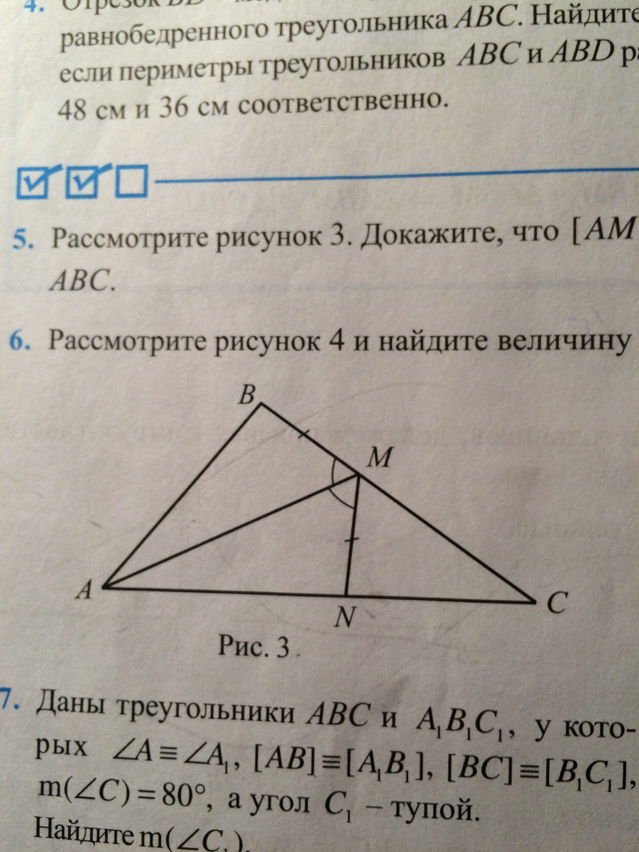 Они равны т.к. BM=MN по условию , AM - общая и угл BMA= углу NMA из этого следует , что угл BAM = углу MAN и видим , что AM- биссектриса по определению биссектриса, что и т.д.