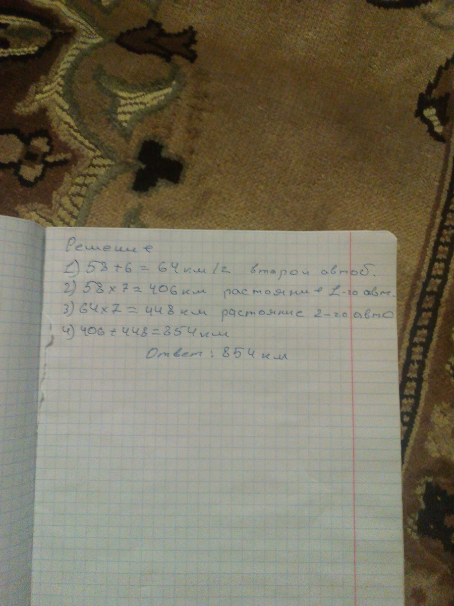 из двух городов навстречу друг другу выехали два автобуса. Первый ехал со скоростью 58 км/ч, а скорость второго на 6 км/ч больше. Найди расстояние между городами, если автобусы встретились через 7 часов. ПОМОГИТЕ ПОЖАЛУЙСТА СРООООЧНО УМАЛЯЯЯЮ