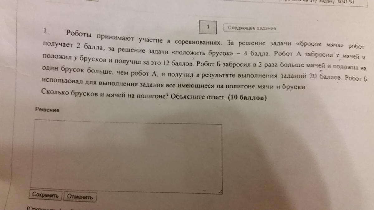 у - брусков положил робот а, тогда у+1 - брусков положил робот б, тогда составим систему: