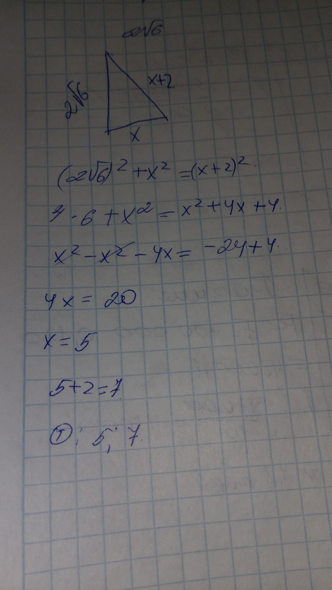 один из катетов прямоугольного треугольника равен 2из под корня 6 см а второй катет на 2 см меньше гипотенузы